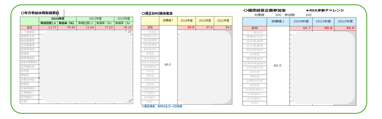 (有給休暇取得率・特定健康診査標準的質問票・研修参加率などの15項目)